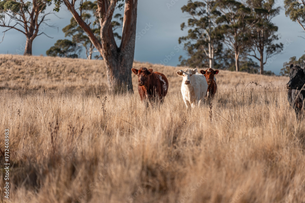 beef cattle livestock in a meadow, sustainable carbon neutral farming being practiced. regenerative raised cows in a field. agricultural technology innovation.