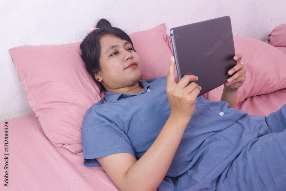 Beautiful asian woman wearing pajama lying on bed using tablet.