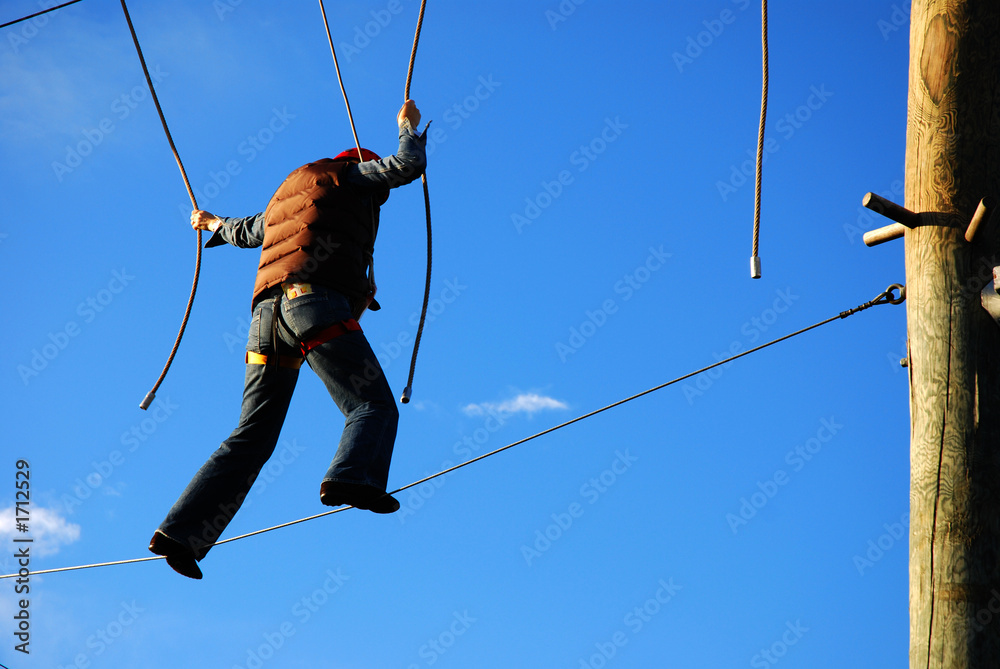 courageous woman standing on a steel wire