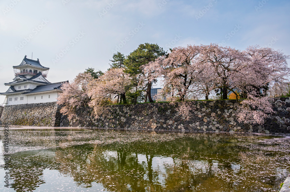 The former Toyama Castle and blossoms bloom over the ramparts and the moat, Toyama Castle Park is popular landmark tourist toyama city, Japan.