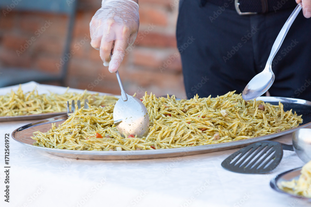 Caterer serving trofie pasta with pesto sauce during a buffet lunch