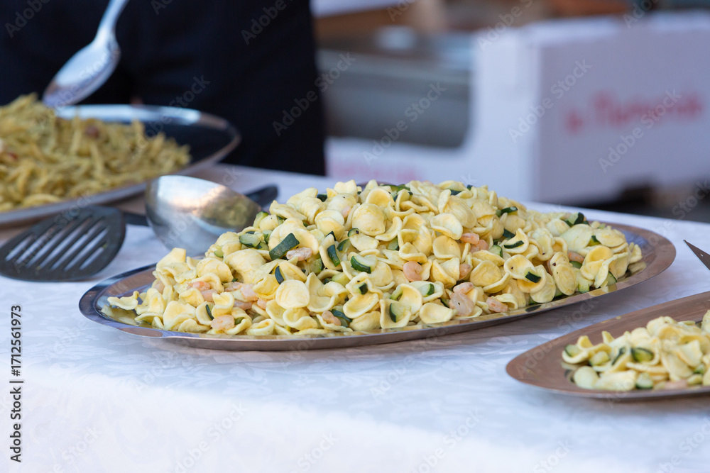 Orecchiette pasta with shrimp and zucchini being served on a buffet table