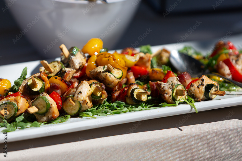 Grilled chicken and vegetable skewers resting on a bed of arugula