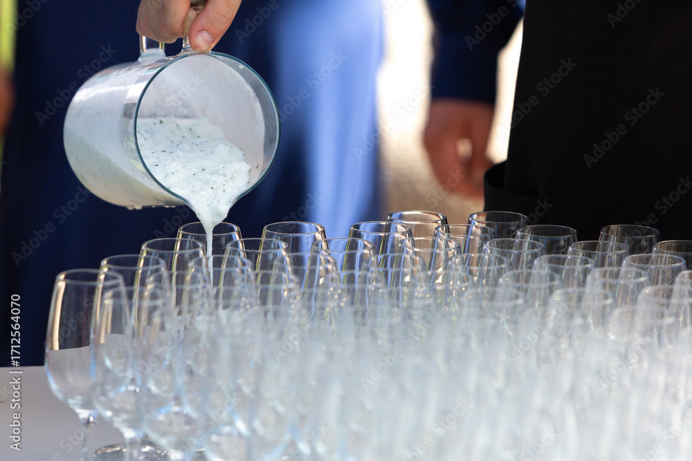 Caterer pouring tzatziki into glasses for a banquet or wedding reception