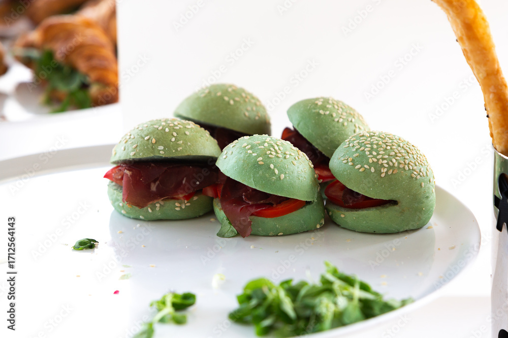 Green burgers with bresaola, tomatoes and sesame seeds waiting on a white plate