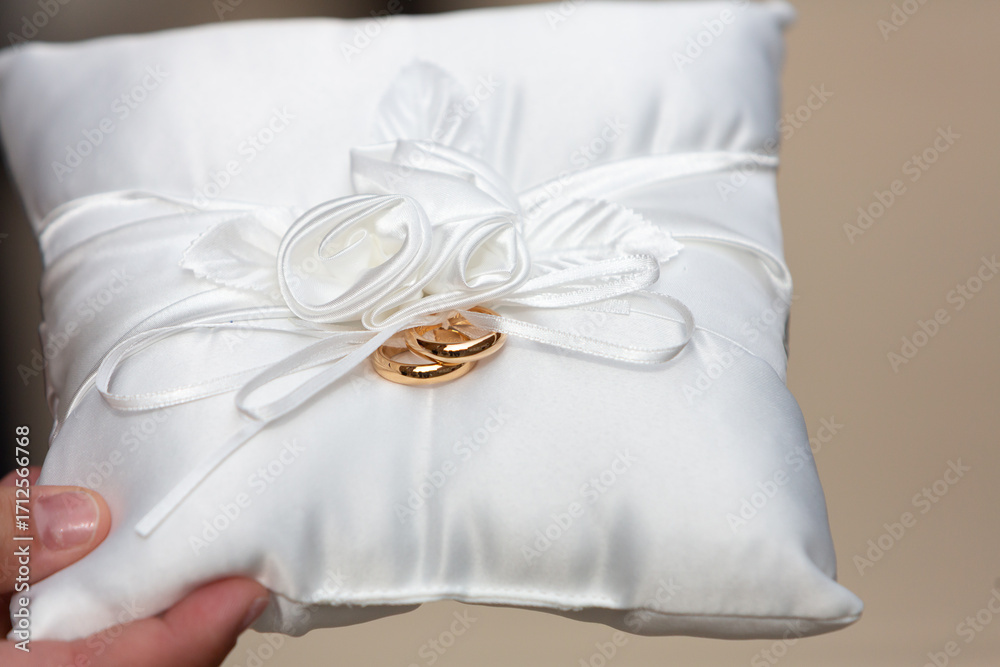 Two golden wedding rings are displayed on a white satin pillow, ready for the exchange of vows