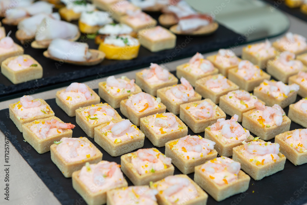 Catering delicious shrimp appetizers presenting on slate tray
