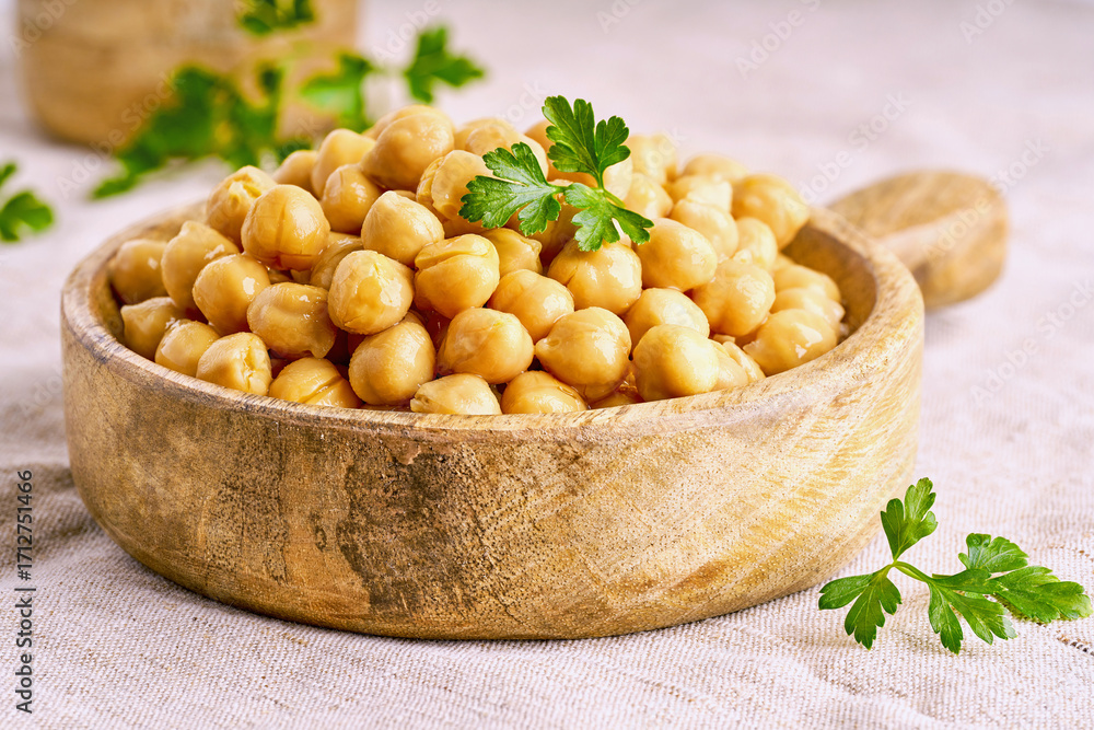 Cooked chickpeas in wooden bowl