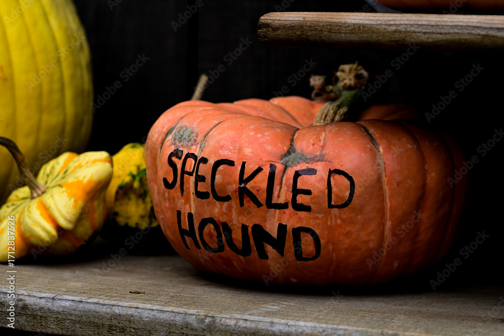 Speckled Hound variety of halloween pumpkin and pumpkins with hand painted font identifying label