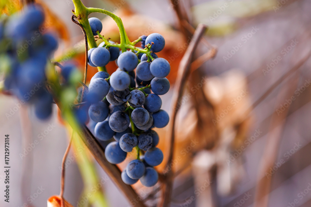 Vineyard harvest grapes in autumn nature. Vineyard grapes in bright autumn light, symbol of seasonal harvest and winemaking.