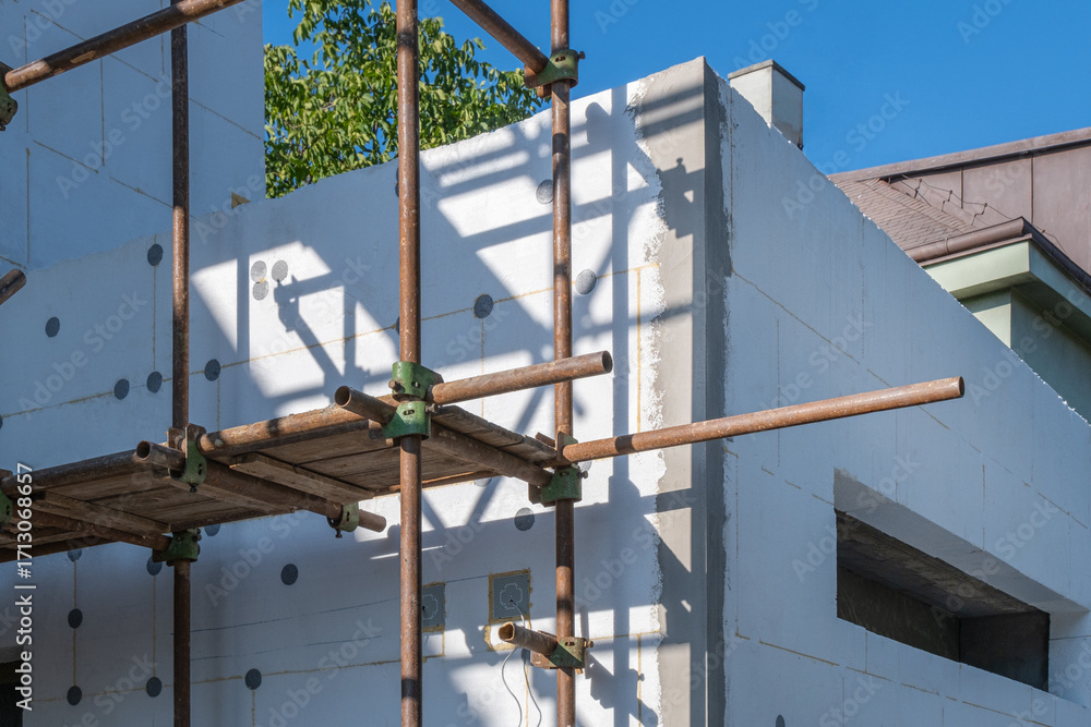 exterior of a building under construction is covered in white insulation panels, with scaffolding casting shadows on the surface. This foam insulation