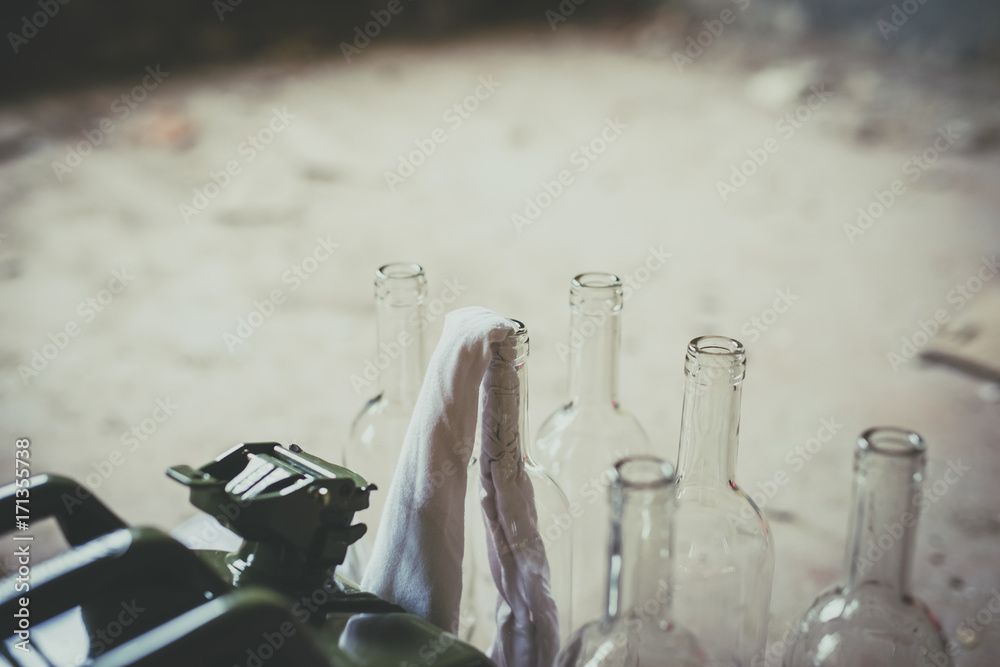 Terrorism. Molotov cocktail. Green military jerrycan with empty bottles
