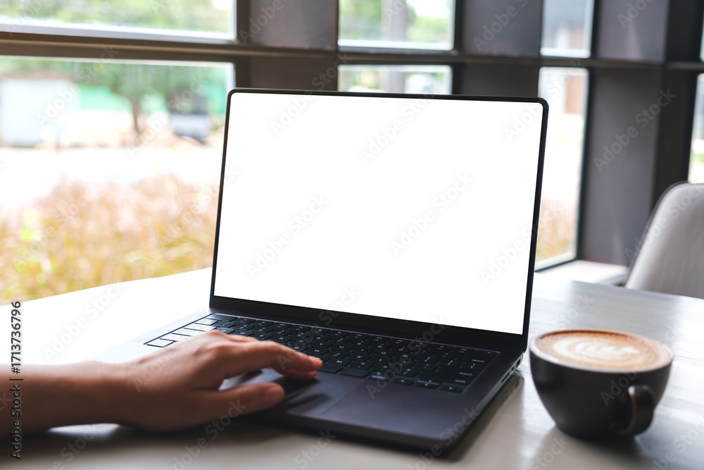 Mockup image of a woman working and typing on laptop computer with blank white desktop screen in cafe