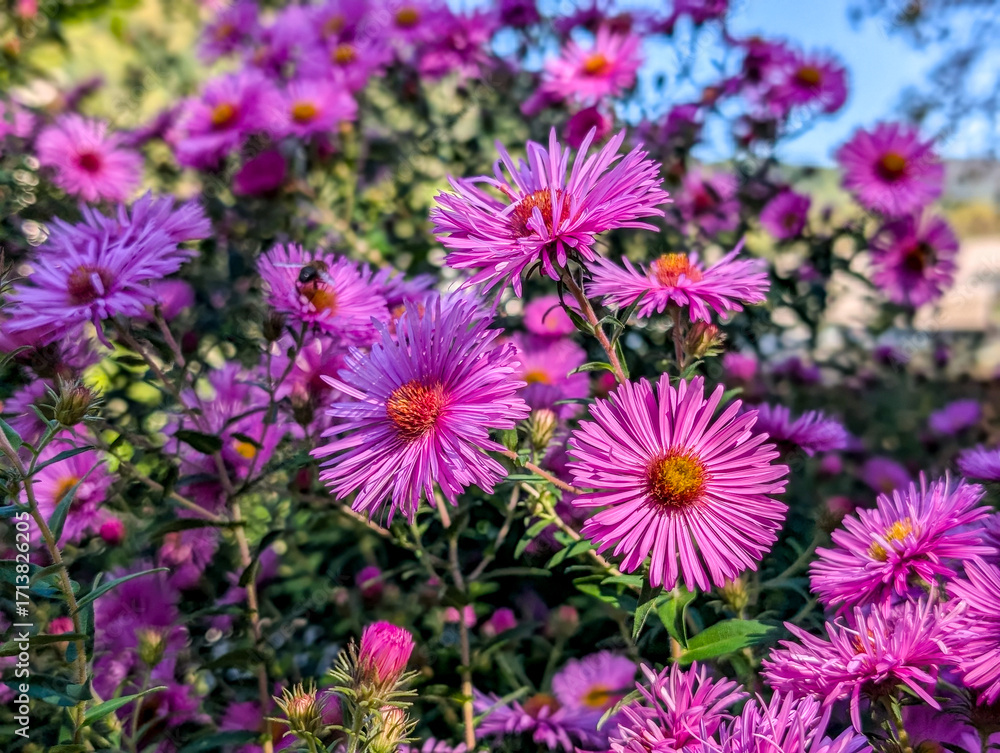 Bright purple-flowering Symphyotrichum novae-angliae, commonly known as New England aster, hairy Michaelmas-daisy, or Michaelmas daisy