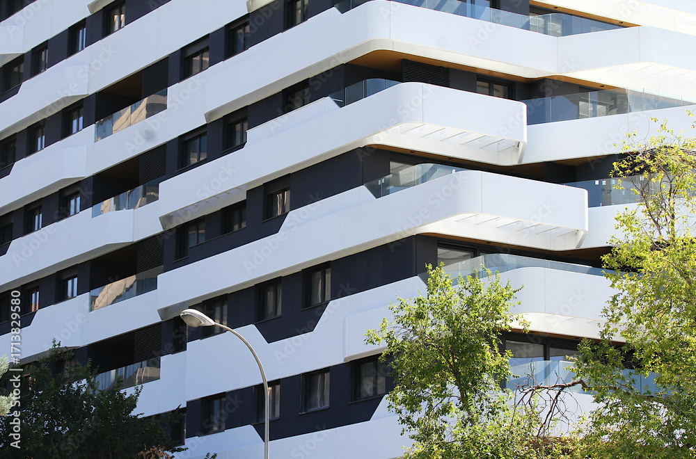 Edificio de moda diseño cebra con apartamentos de nueva construcción en franjas blanco y negro en Madrid