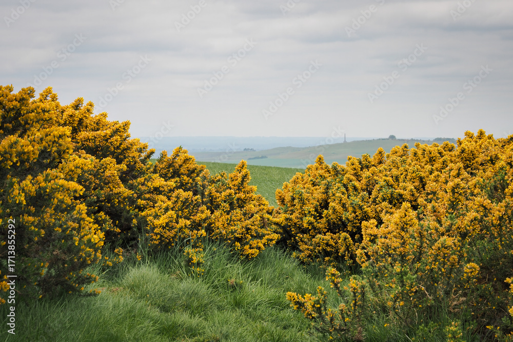 Looking through yellow gorse to Lansdowne Monument on Cherwill Down, Wiltshire