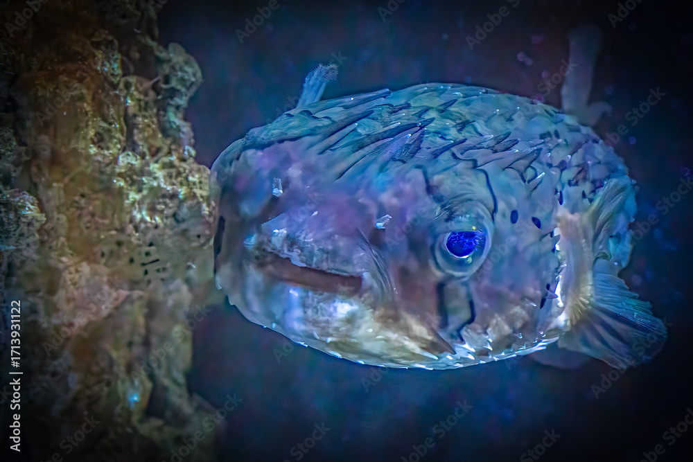 A Long-Spine Porcupinefish with Vibrant Blue Eyes Swimming in Dark Water