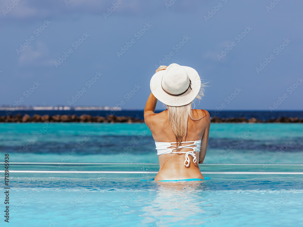 Attractive blonde girl with sensual body on the tropical Maldives Summer beach resort
