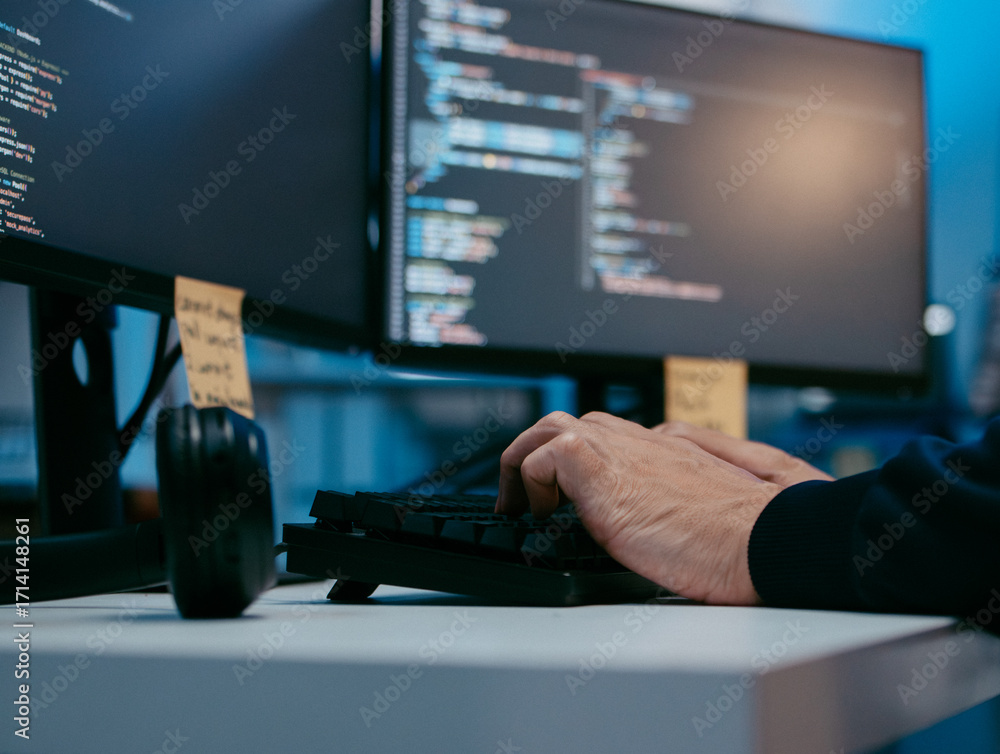 Close-up of Male Computer Programmer Hands Typing on Computer Keyboard, Screen Displaying Lines of Code, Professional Male Software Development, Writing Code, Working software program at desk.