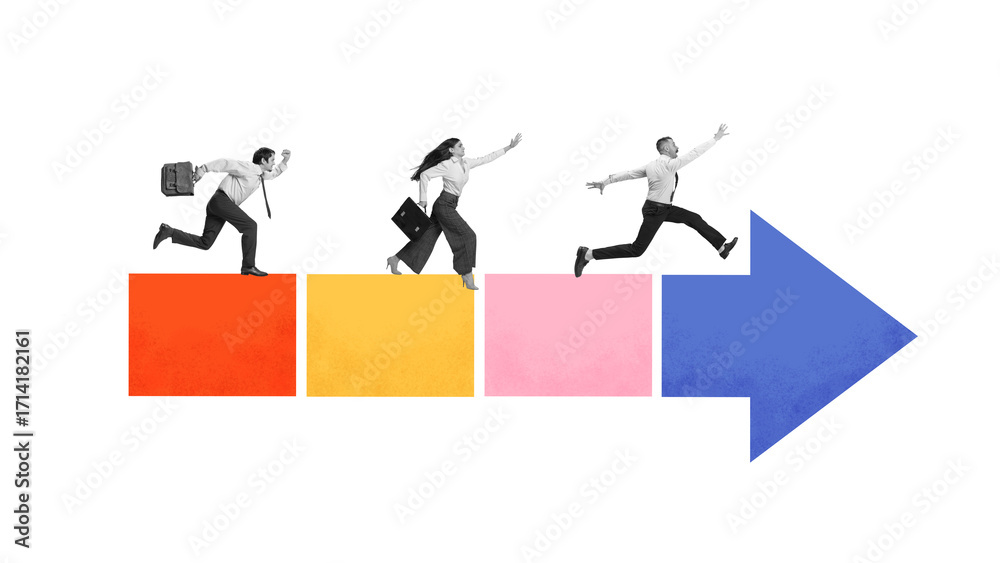 Creative digital artwork. Business people running on colorful blocks and arrow symbolizing progress. Concept of corporate growth, marketing strategy, startup energy and organizational success.