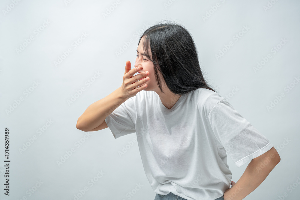 A beautiful young Asian woman laughing joyfully while covering her mouth with her hand. This image conveys happiness and positivity, suitable for business, advertising, and lifestyle concepts.