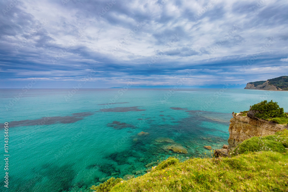 Picturesque view of the coast of the Greek island of Corfu with a beach and turquoise water under a cloudy sky, background or wallpaper for the project