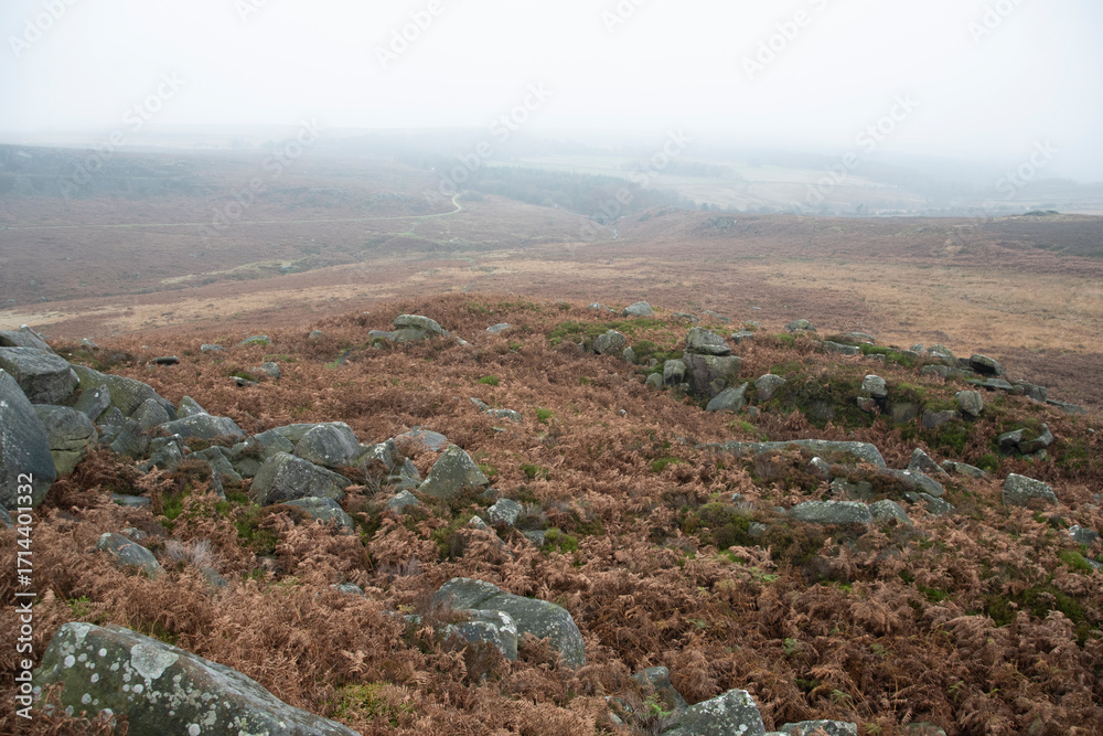 Mist descends and obscures the landscape on a foggy day in the Peak District