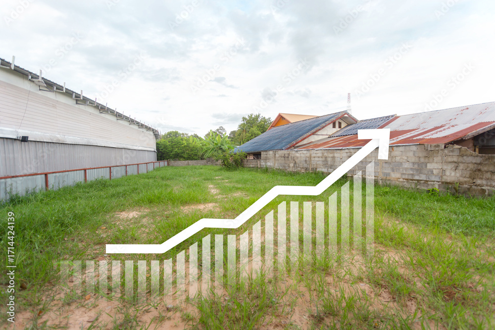 Land, landscape or green field in aerial view. Include house building, bar chart or graph, increase graph arrow. Real estate or property with concept for sale price, land price, property tax.
