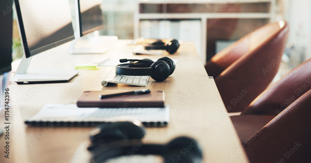 Call center, keyboard and online with headset in empty office for customer support, help desk or crm. Contact us, sales hotline or lead generation with headphones in agency interior for communication