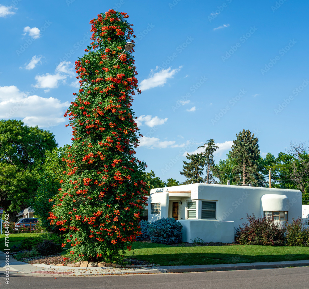 A blooming Trumpet Vine plant, lush and beautiful, that has grown significantly in height on a street corner lamp post.