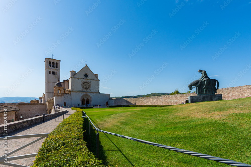 Famous Basilica of St. Francis of Assisi (Basilica Papale di San Francesco) at sunset in Assisi