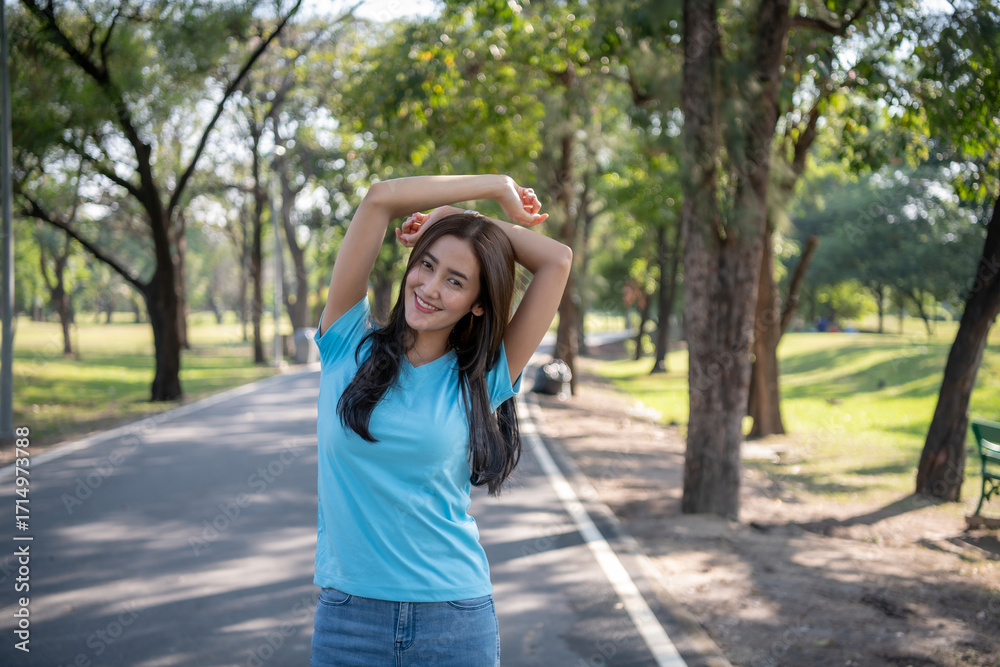 A young woman enjoying a sunny day in a park, stretching happily outdoors.