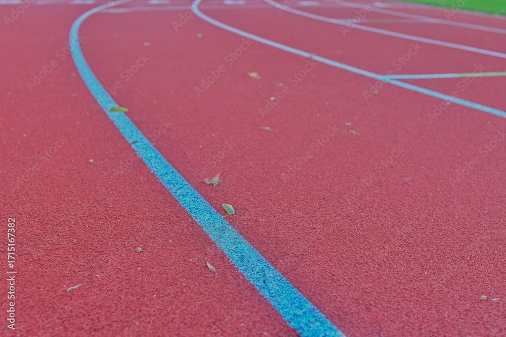 View of an athletic track. Tartan surface on an athletic field with lanes. Concept of sports, jogging and athletics.