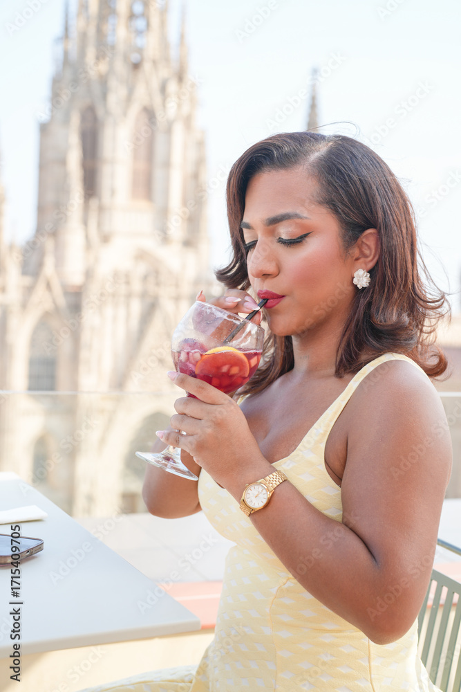 A woman in a yellow dress is drinking from a wine glass. She is wearing a watch and has a red lip. The image has a relaxed and casual mood