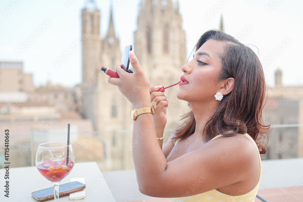 A woman is applying lipstick while sitting at a table with a drink. The scene is set in a city with a beautiful view of a castle in the background. The woman is wearing a watch and a flower earring
