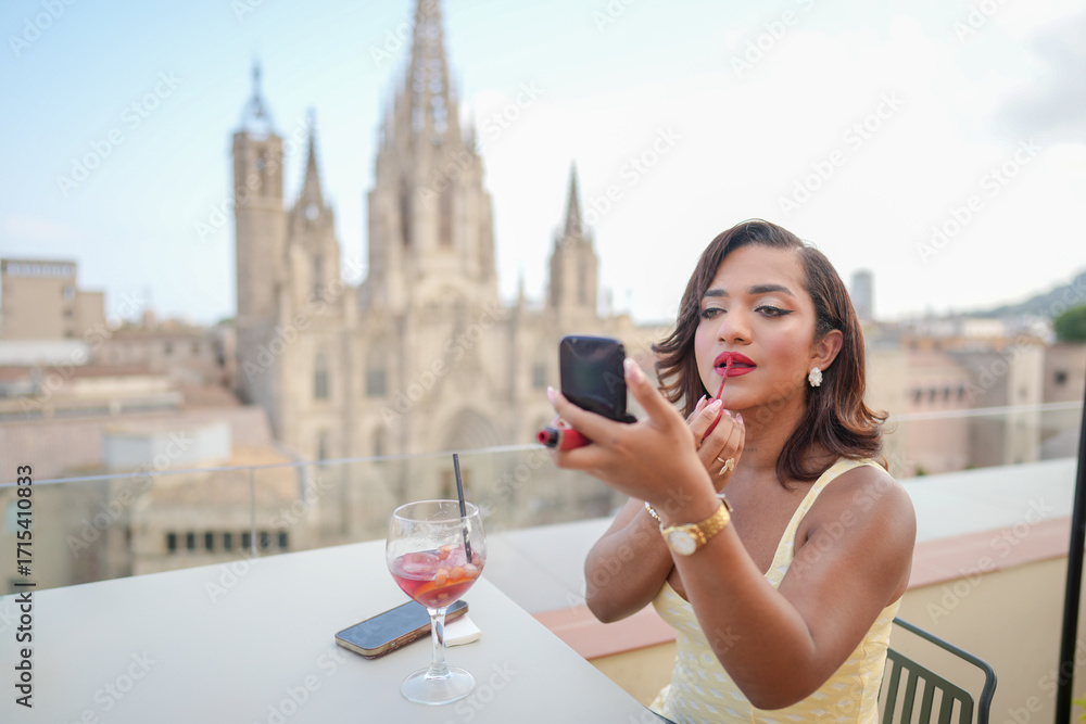 A woman is sitting at a table with a glass of wine and a cell phone. She is applying lipstick while looking at her reflection in a compact mirror. Concept of relaxation and self-care