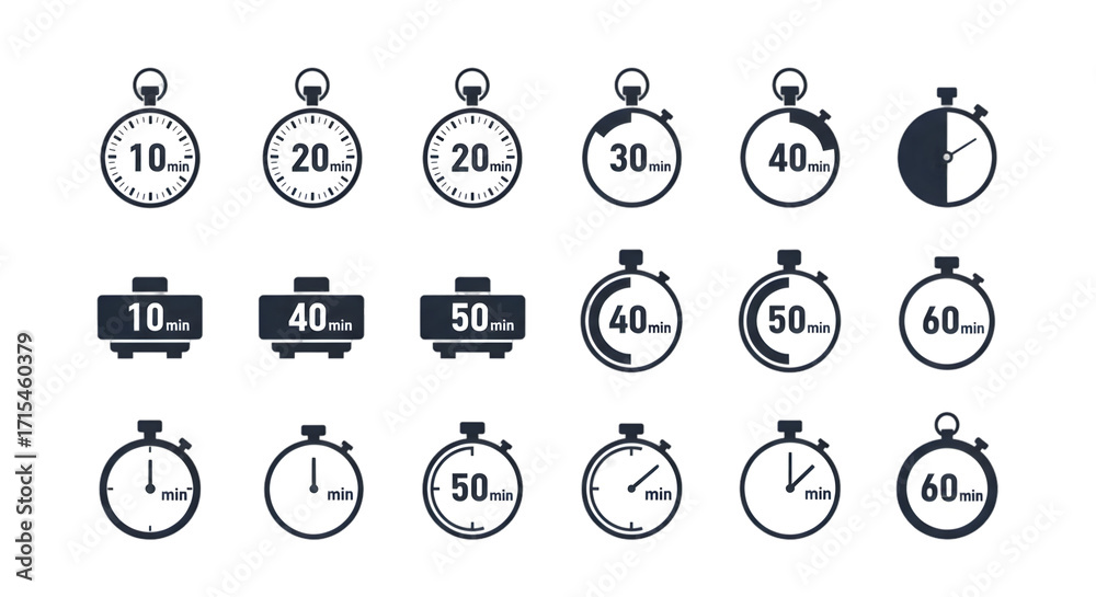 Time ticking away with timers for project management and countdowns from 10 to 60 minutesisolated on transparent background