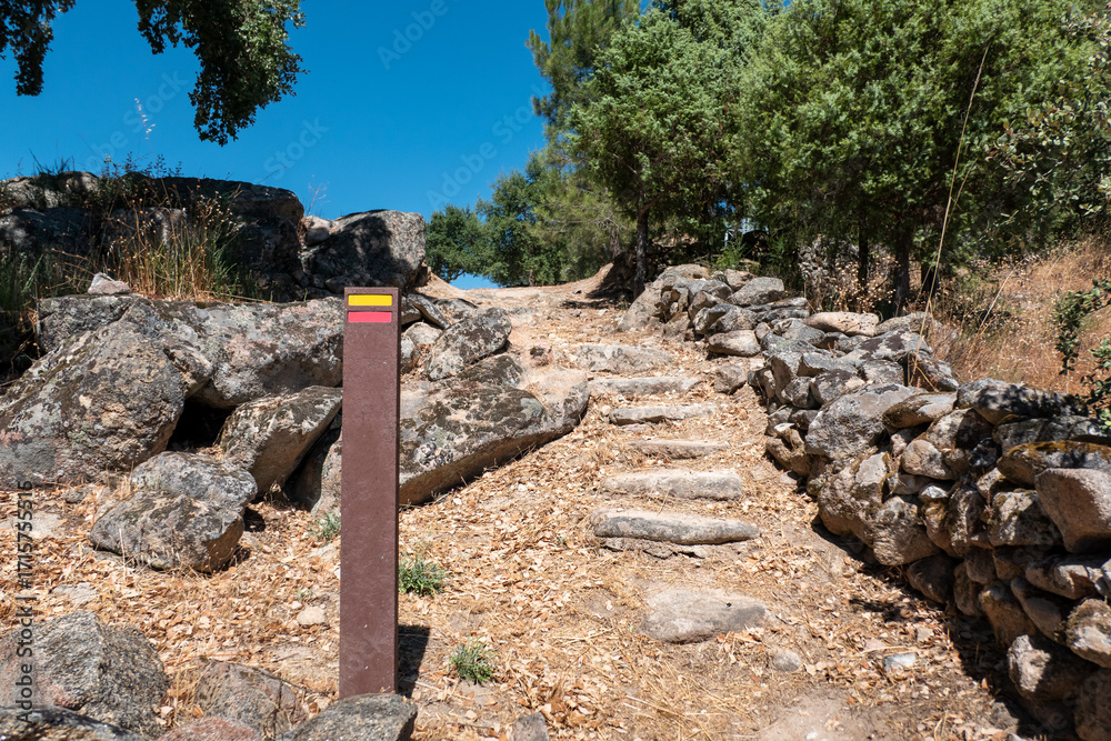 Sinal de caminhadas pedestres em meio a uma trilha na natureza num dia ensolarado
