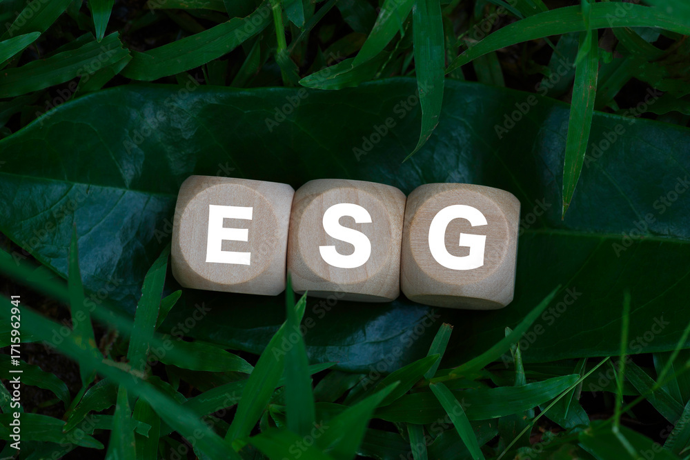 Wooden blocks with ESG letters on green leaves, symbolizing environmental, social, and governance principles in sustainable investing.