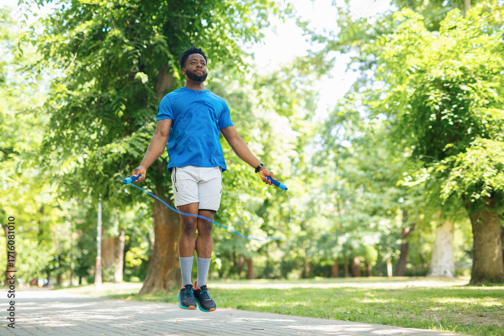 Young man jumping rope in park, exercising outdoors on a sunny day.