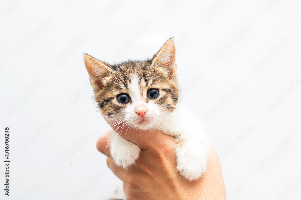 A person holds a small brown and white kitten in their hand