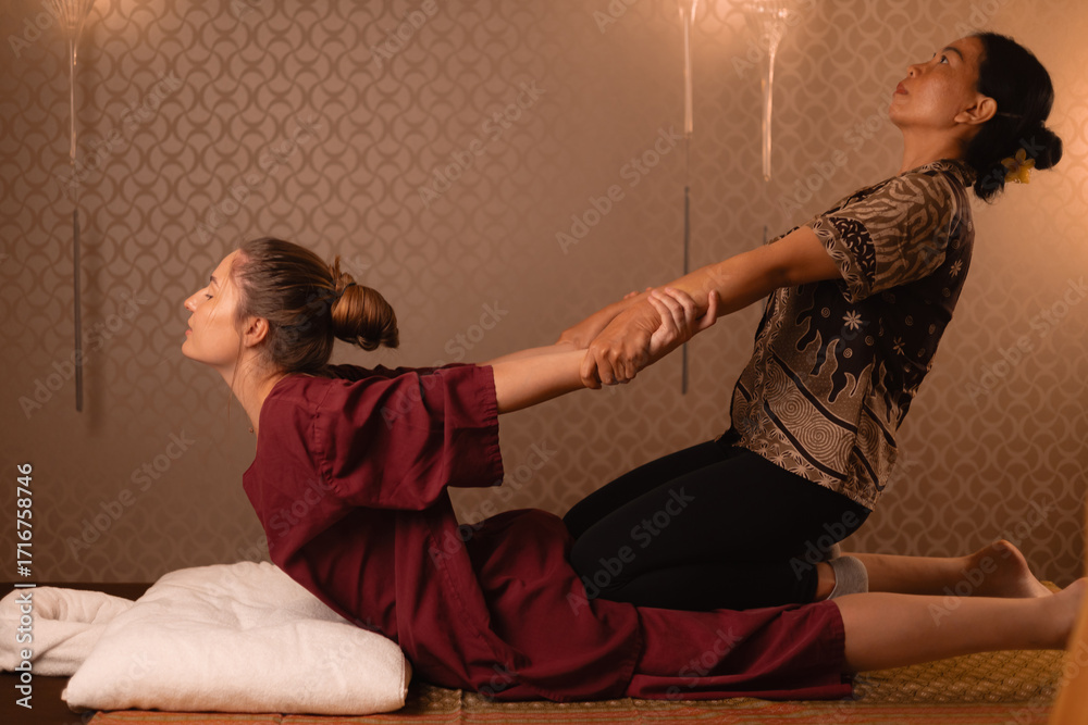 Female practitioners engaged in traditional thai massage passive yoga therapy session