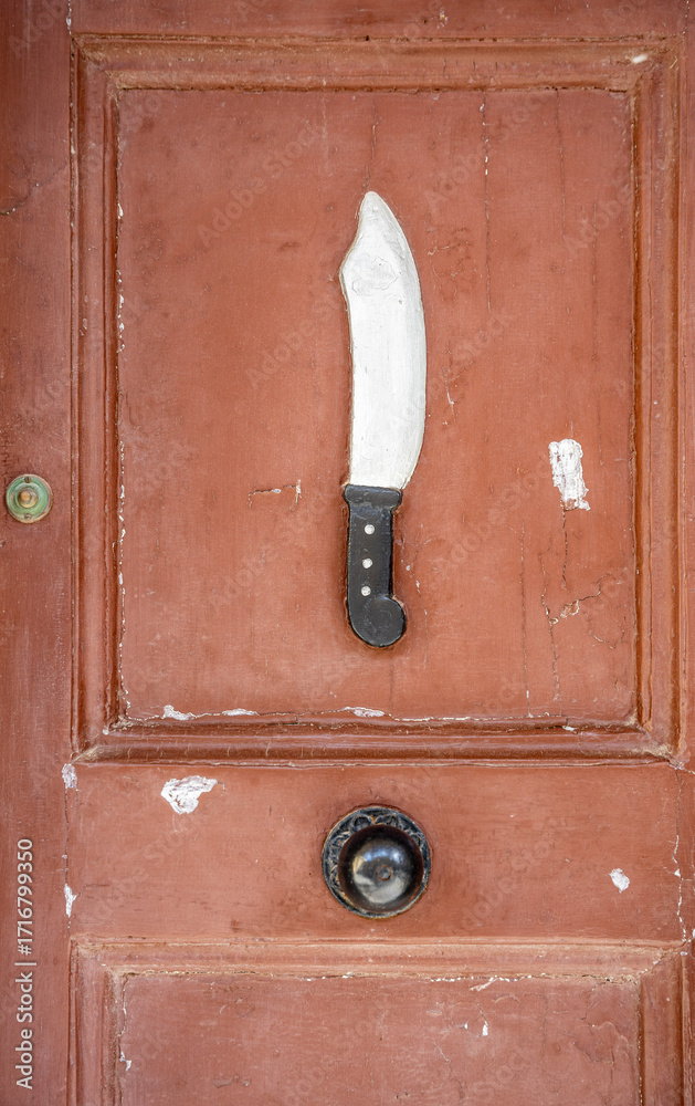 Detail of the wooden door of Biblioteca Forteguerriana with carved knives in relief, symbol of Saint Bartholomew and his martyrdom, in Pistoia, Tuscany, Italy