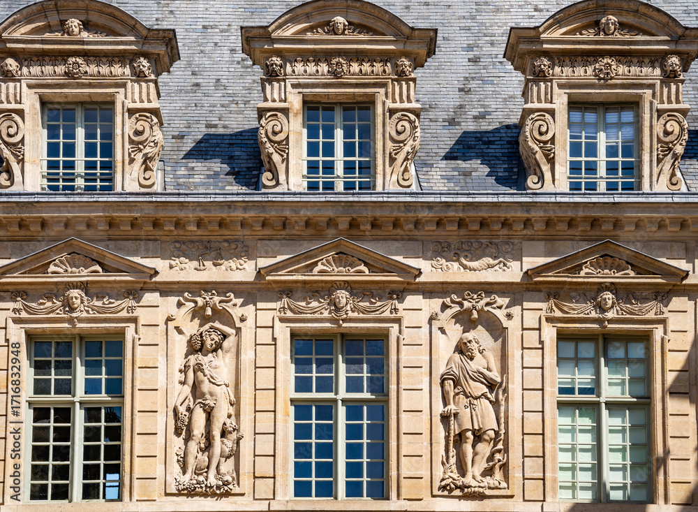Courtyard of Hotel de Sully, 17th century palace built by Jean Androuet du Cerceau, now seat of Centre des monuments nationaux, in the Marais district of Paris, France