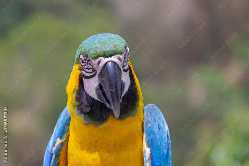 View of a Blue-and-yellow Macaw (Ara ararauna) staring directly into the camera. The vibrant colors of its plumage are the focus, with a striking blue crown and wings, and a bright yellow chest.