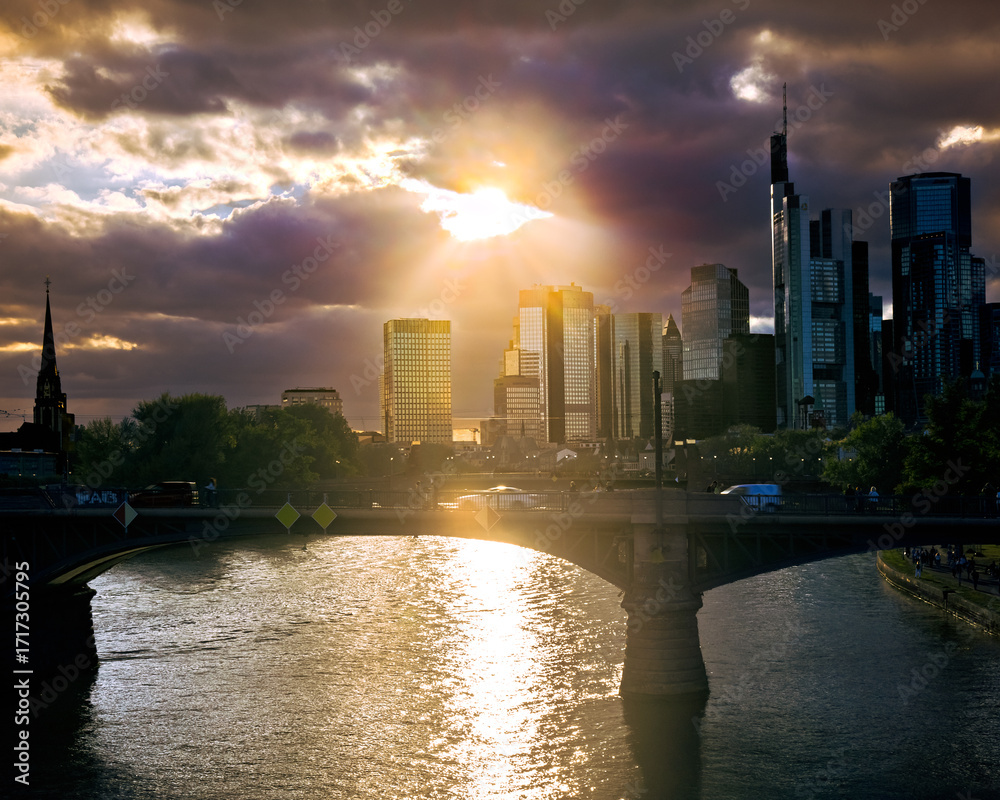 Frankfurt Skyline at Sunset with Reflections on the Main River. Dramatic clouds and golden light create an atmosphere ideal for themes of travel, architecture, city life, and European destinations.