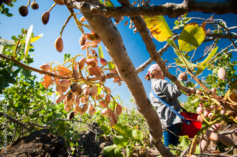 Closeup view of a pistachio bunch on tree and a picker at work in the background, Bronte, Sicily