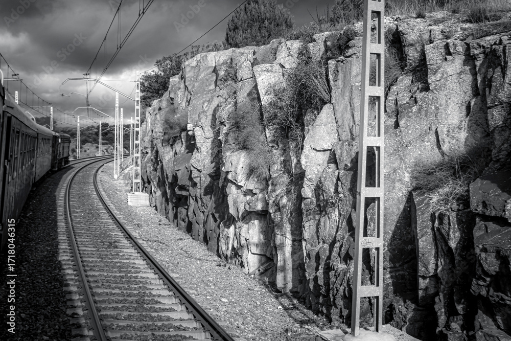 Black and white railway scene with train passing next to rugged rock cliffs.