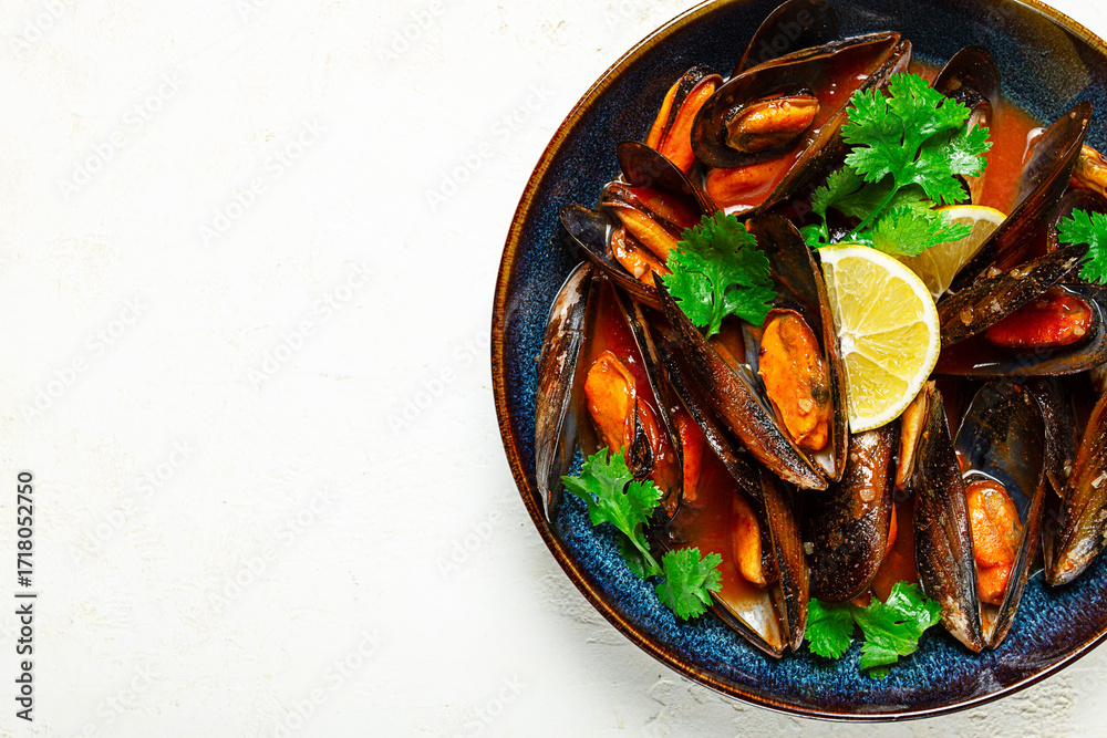 mussels in tomato sauce, homemade, no people,