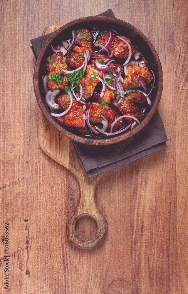 fried meat, pork kebab, ketsi in a clay pan, with red onions and herbs, homemade, no people,